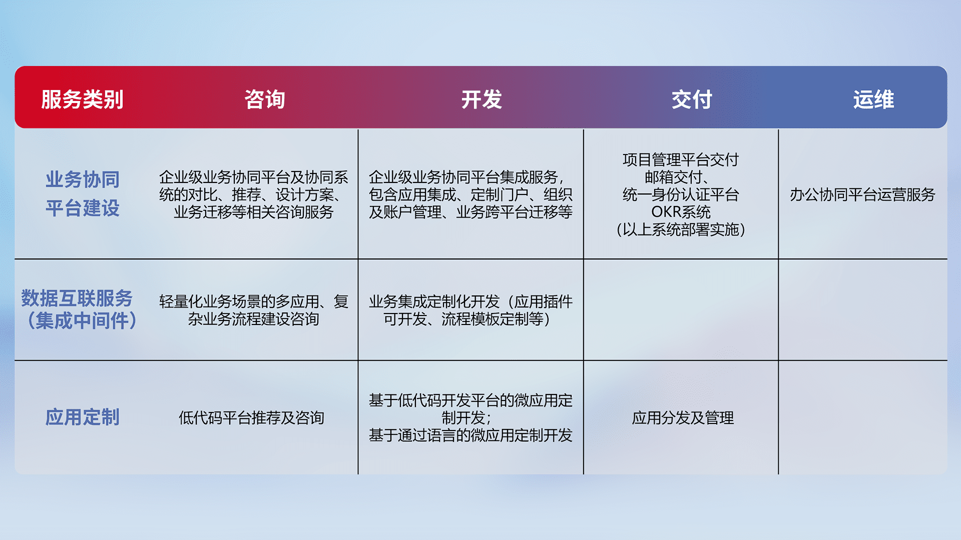 针对钉钉、、、企微、、、、IDaas等平台级产品提供产品的规划、、方案、、、、交付、、、定制化开发等服务,,实现如统一协同办公、、、、智能客户服务、、混合会议管理、、、、智能数据查询、、、等业务场景,,,实现数字化转型。。。